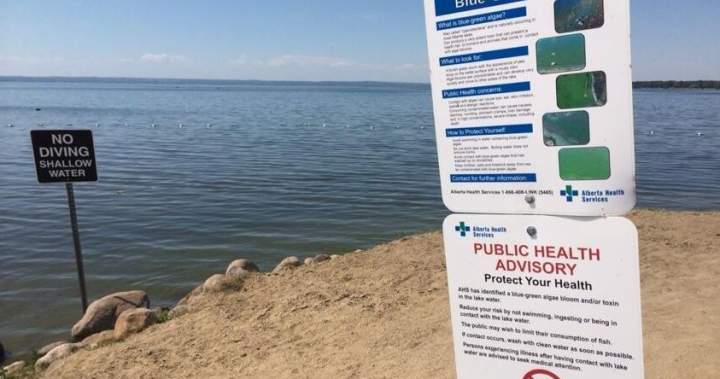 Alberta Health Services has advised visitors and residents not to swim or wade in areas where blue-green algae is visible, to avoid providing drinking water from the lake to pets or livestock, and to consider limiting human consumption of fish from the lake.